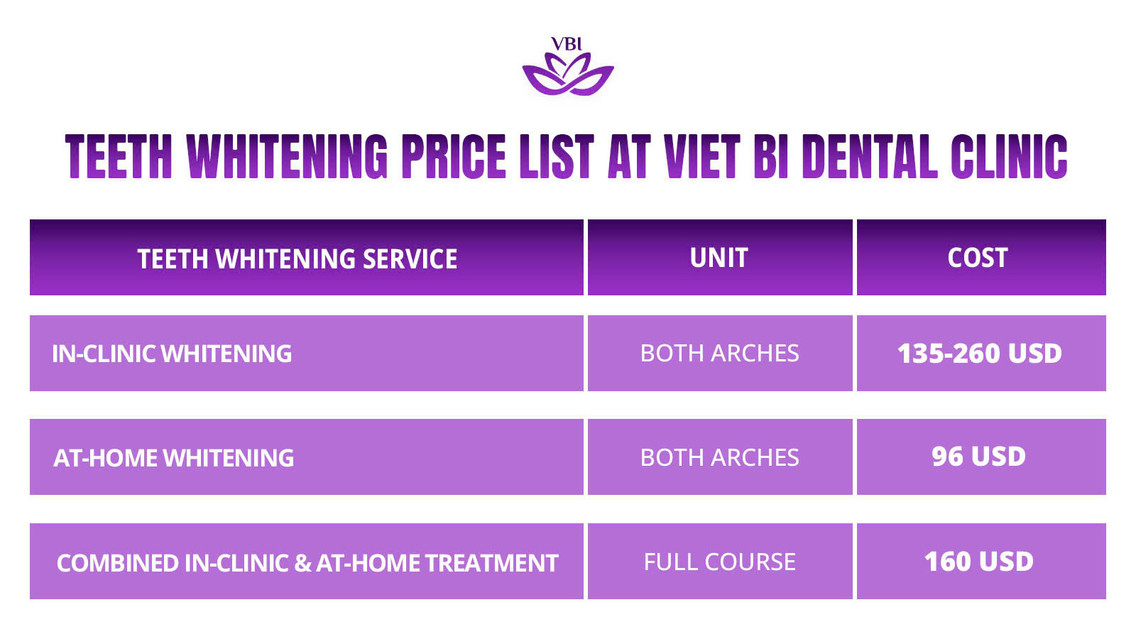 Teeth Whitening Price List at Viet Bi Dental Clinic